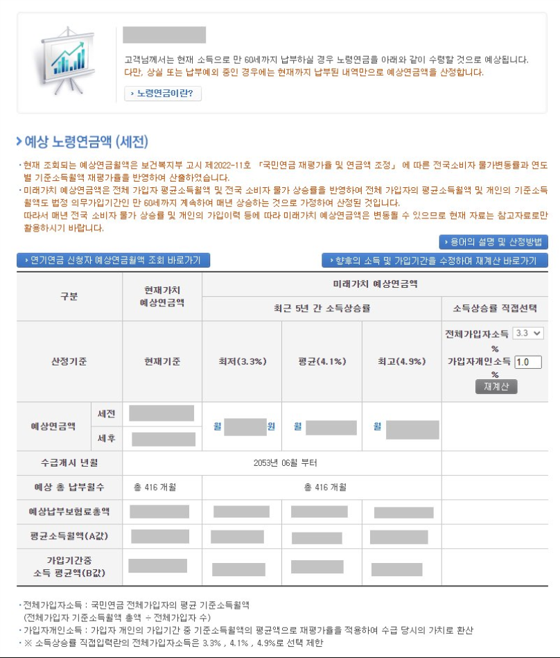 연기연금 신청자 예상연금월액 조회의 경우 왼쪽 상단 버튼을 통해서 이동하시면 되시며, 노령연금액은 물가에 따라서 조금씩 변할 수 있습니다. 예상연금액은 최근 5년간의 소득 상승율로 계산이 되며, 최저 3.3, 최고 4.9로 계산이 됩니다.