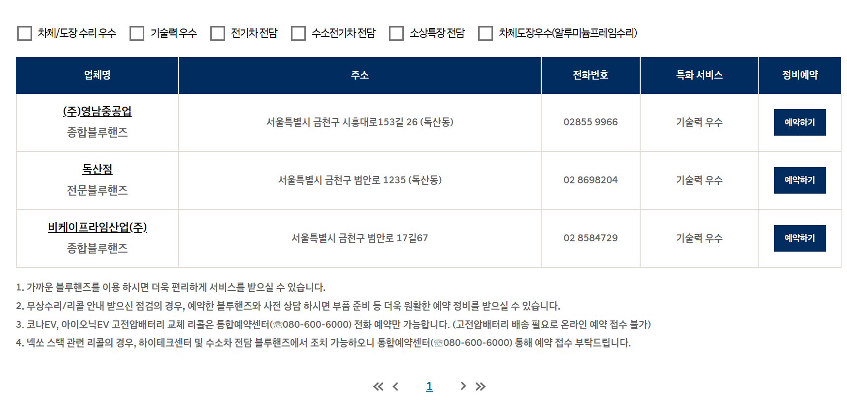 제가 주거하고 있는 금천구로 조회를 해 보았습니다. 3개의 블루핸즈 지점을 확인할 수 있는데요. 특화서비스가 기술력우수로 표기되고 있으며, 정비예약까지 가능하네요.