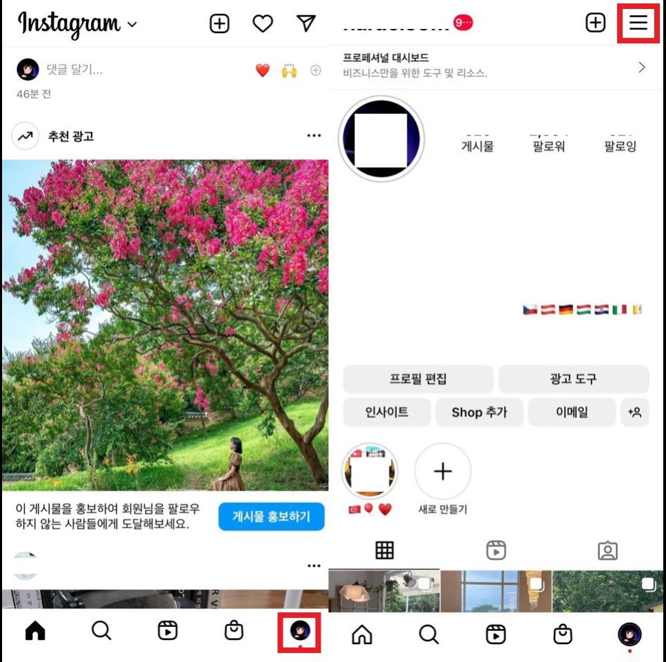 우선 인스타그램 앱으로 해지하는 방법을 알아볼께요. 인스타그램의 푸쉬 알림은 여러가지 상황에 따라서 알림을 켜고 끌 수가 있는데요. 인스타그램 앱에 접속을 하신 후 피드가 보이는 페이지 외에 오른쪽 하단에 있는 자신의 프로필을 클릭 해 주세요.