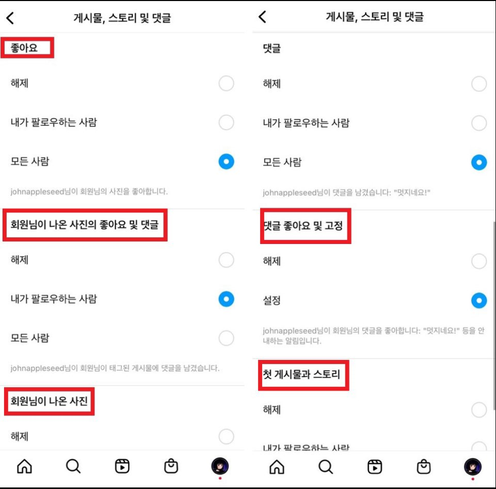 푸쉬알림 밑에는 게시물, 스토리와 댓글 팔로잉이나 팔로워, DM등 알림을 해제, 내가 팔로우하는 사람 혹은 모든 사람으로 설정을 할 수가 있습니다. 이기능을 보면 팔로우 하는 사람중에 좀더 친한사람을 구분해서 알림을 받을 수 있는게 좋아보이네요.