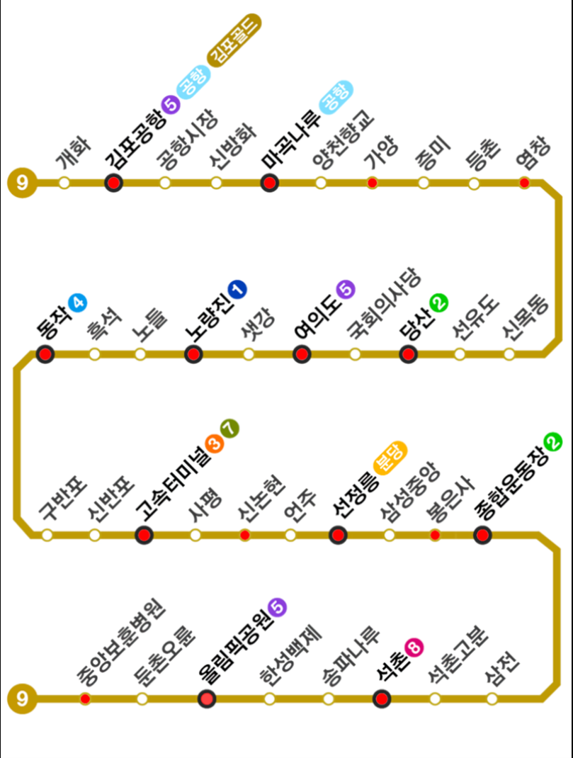 김포공항, 마곡항, 가양, 염창, 당산, 여의도, 노량진, 동작, 고속버스터미널, 신논현, 선정릉, 봉은사, 종합운동장, 석촌, 올림픽공원, 중앙보훈병원.